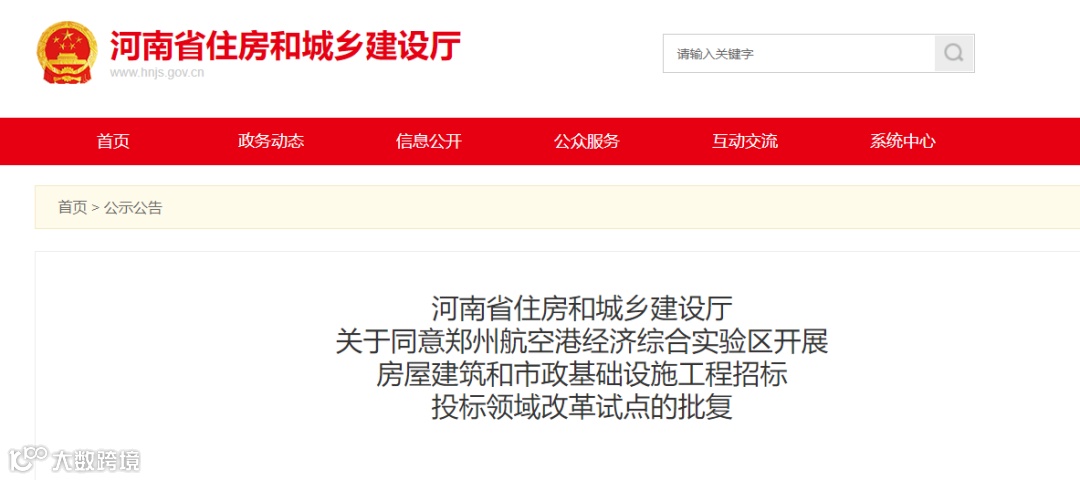 2020年11月底河南省住房和城乡建设厅官网发布了一则《河南省住房和城乡建设厅关于同意郑州航空港经济综合实验区开展房屋建筑和市政基础设施工程招标投标领域改革试点的批复》的公告: