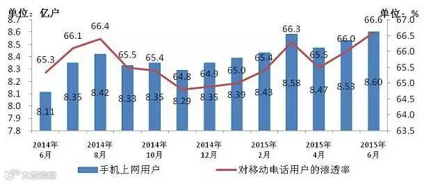 2014-2015年6月手机上网用户和对移动电话用户渗透率情况