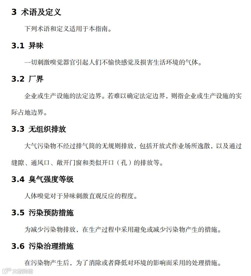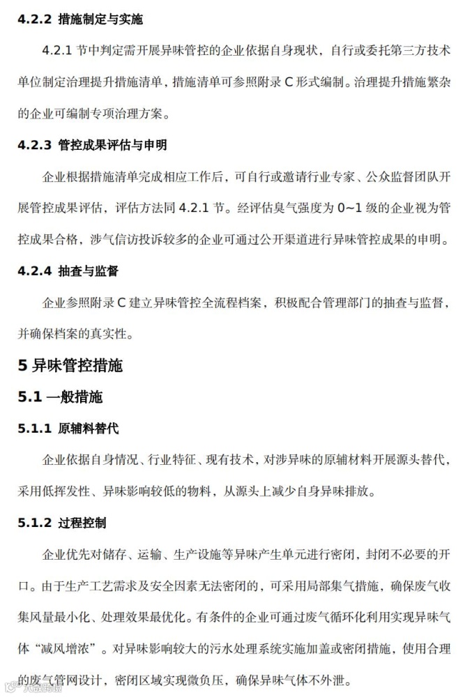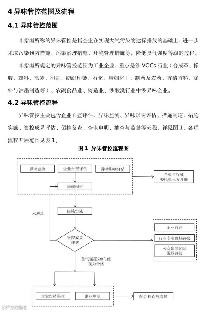 指南所称的异味管控是指企业在实现大气污染物达标排放的基础上,进一步采取污染预防措施、污染治理措施、环境管理措施等,降低臭气强度等级的过程。本指南所规定的异味管控范围为工业企业,重点是涉VOCs行业(合成革、橡胶、塑料、涂装、印刷、纺织印染、石化、精细化工、制药及农药、香精香料、涂料与油墨制造等)、农副食品业、铸造业、涉酸洗行业中涉异味企业。