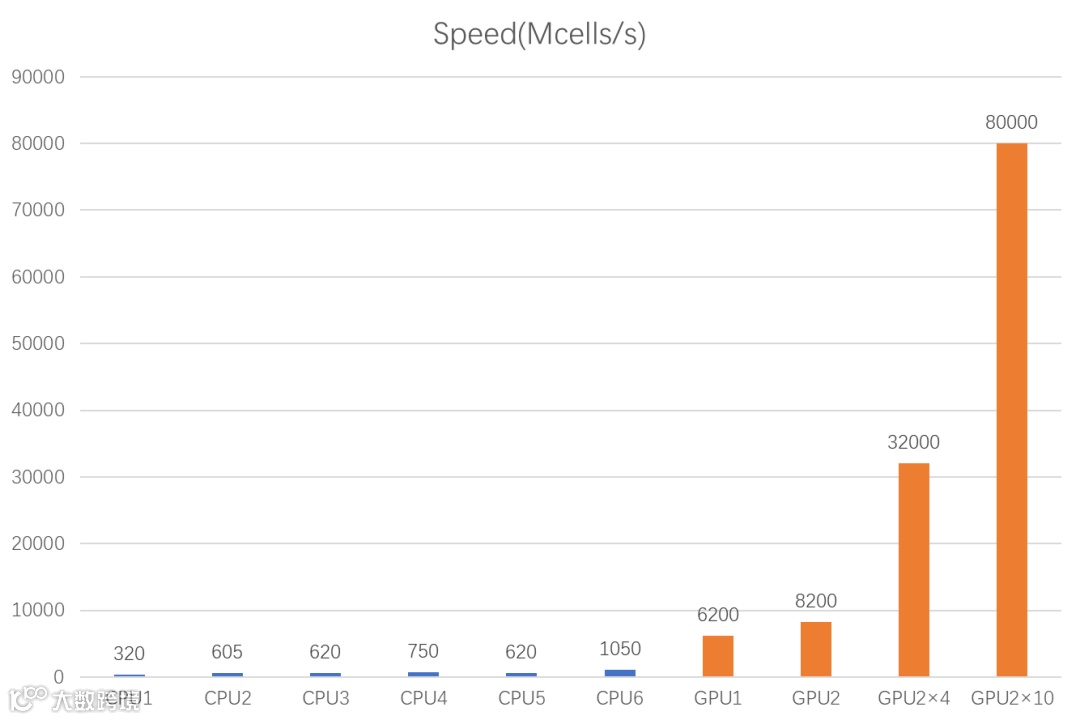 特别是在GPU×10服务器平台上,FDTD计算速度可达80000Mcells/s,与40核CPU相比达到百倍以上速度提升!