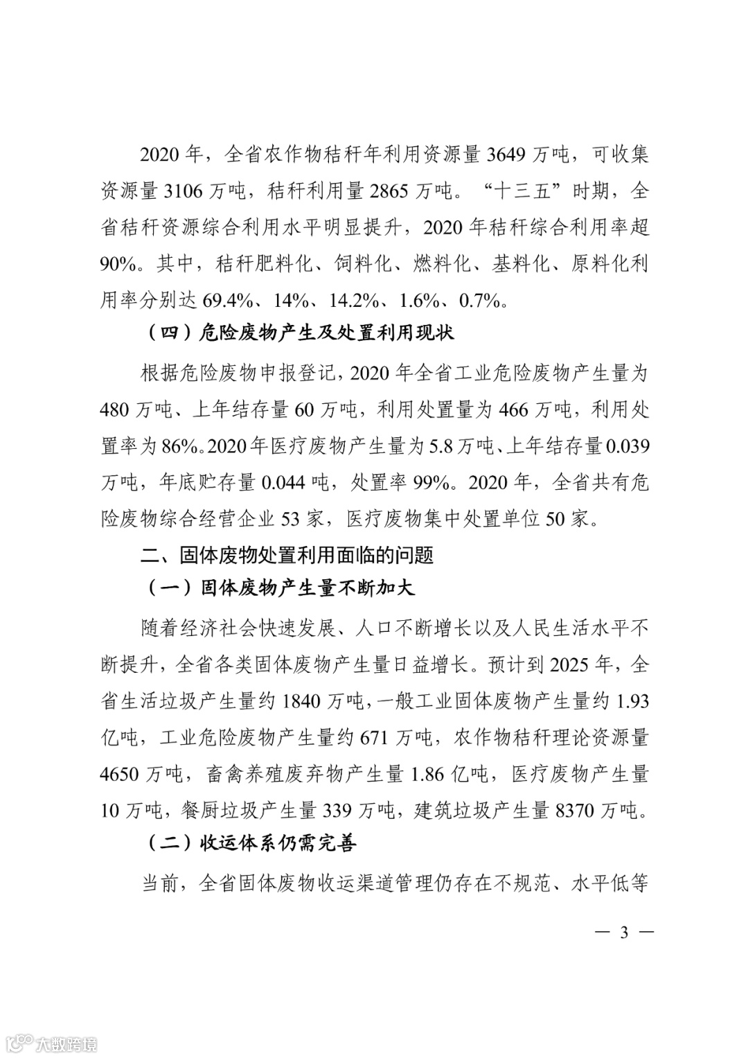 11月29日,四川省发改委发布《四川省“十四五”固体废物分类处置及资源化利用规划》,规划要求到2025年,基本建成覆盖全省的现代化固体废物收运网络和监管平台,基本实现区域内固体废物产生量与利用处置能力相匹配,医疗废物收集处置体系覆盖率达到 98%以上。固体废物监督管理体系有效运行,形成较为完善的固体废物闭环管理体系。固体废物综合利用能力显著提升,利用规模不断扩大,利用水平不断提高,综合利用产业体系不断完善,一般工业固体废物综合利用率达到 45%左右;农作物秸秆综合利用率保持 90%以上,城市建筑垃圾综合利用率不低于 50%。全文如下: