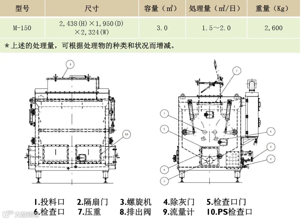 a.LTTD-M150 对垃圾分类后的可燃垃圾如:废纸箱、书报杂志、树枝、树叶、废餐盒、废塑料袋、医疗废物中的纸尿裤、废床单、废输液袋、注射推管等有机废物,可一起投入。因为设置了消臭、消烟的装置,所以在处理中几乎不会产生黑烟和异味。对工业废弃物如:废弃的塑胶手套、化纤编织袋等高分子废弃物。有机性的废料在磁性低氧气的气氛下受到低温(200-250℃)的热分解最终成为陶瓷灰。(重量比1/200以下)