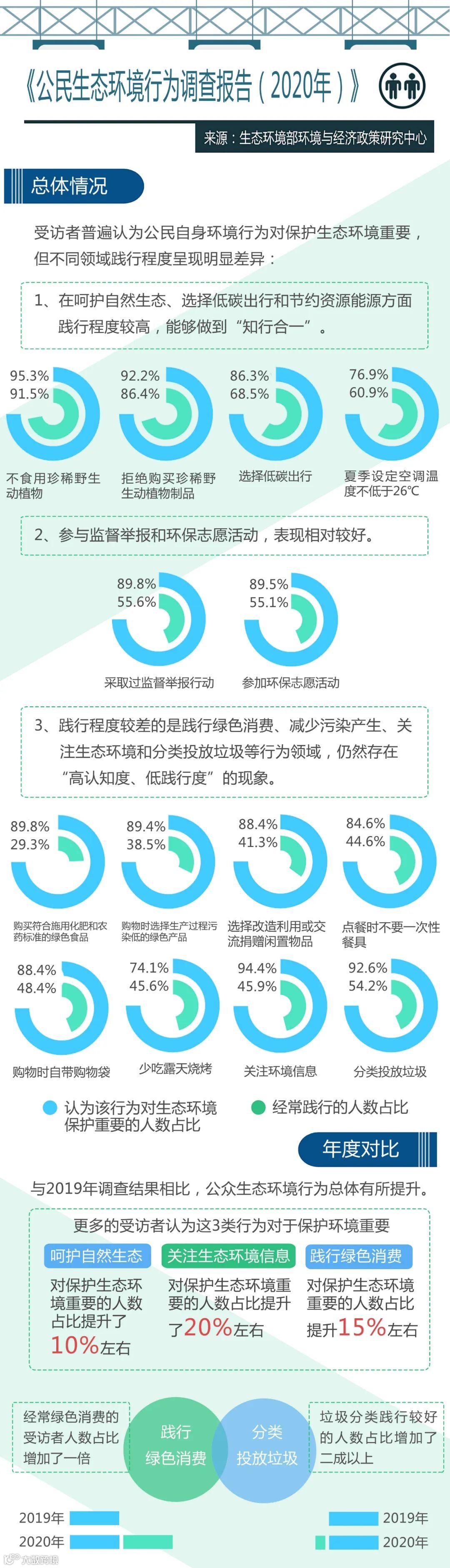 7月14日,生态环境部环境与经济政策研究中心向社会公开发布《公民生态环境行为调查报告(2020年)》,覆盖《公民生态环境行为规范(试行)》中10类行为领域,并重点关注生态环境、践行绿色消费、参加环保志愿活动和污染防治攻坚战公众评价等专题。