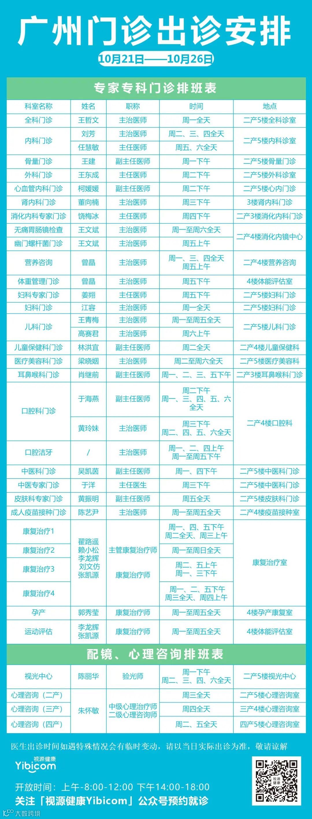 【出诊信息】1021-1026广/苏州门诊出诊安排