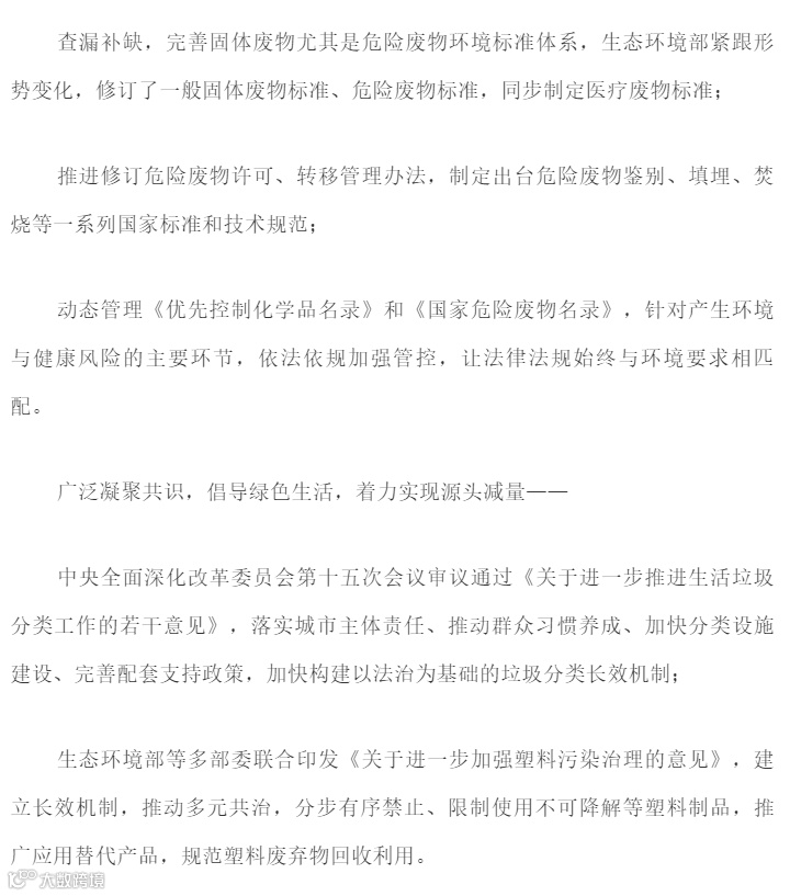 组织开展长江经济带打击固体废物环境违法行为专项行动,对固体废物和危险废物非法转移倾倒问题进行全面摸排核实;在全国范围内开展危险废物专项整治三年行动,以危险化学品单位和化工园区等为重点,排查整治危险废物环境风险隐患。
