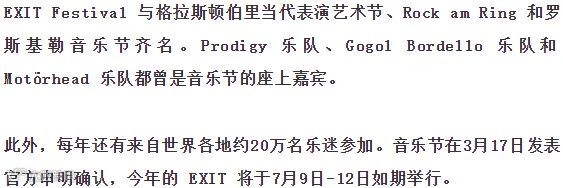 EXIT Festival 源于2000年的一场学生运动,为了呼吁塞尔维亚和巴尔干地区的民主和自由。第一届音乐节持续了足足有100天,其所倡导的「音乐是一种通用语言,它能把人们联系在一起,使世界变得更美好」宗旨延续至今。
