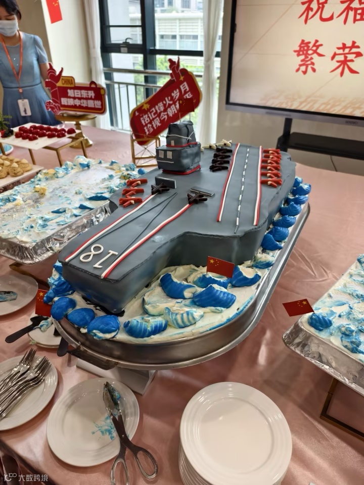 除了精彩的活动,各园区餐厅还打造了“爱国主题美食节”,让大家在味蕾体验中感受历史温度。餐厅内循环播放《我和我的祖国》《在希望的田野上》等红色歌曲,餐桌上摆放着以 “军事元素” 为灵感设计的菜品:造型似 “航母” 的蛋糕、印有 “抗战胜利 80 周年” 字样的主食…… 每一道菜品都承载着特殊的意义,让大家在品尝美味的同时,重温那段艰苦卓绝却热血沸腾的岁月,也更加珍惜如今的幸福生活。