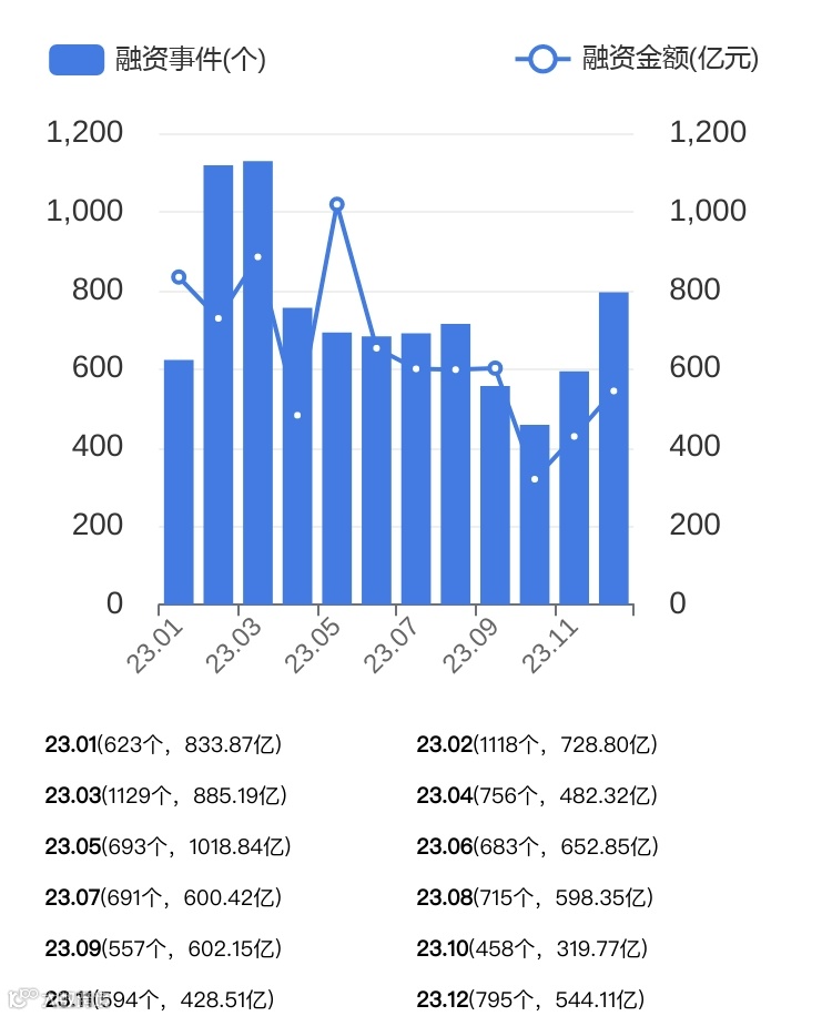 睿兽分析数据显示,2023年12月中国一级市场发生融资事件795个,比上月增加201个(