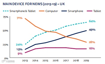 人们仍然在使用电脑和平板电脑获取新闻,但当问到首选设备时,智能手机往往会因为便利性和通用性胜出。在英国,智能手机于2017年超过平板电脑成为主要新闻接触设备。由于平板电脑的稳定性,少数老用户和富裕用户仍然偏向于通过其获取新闻。