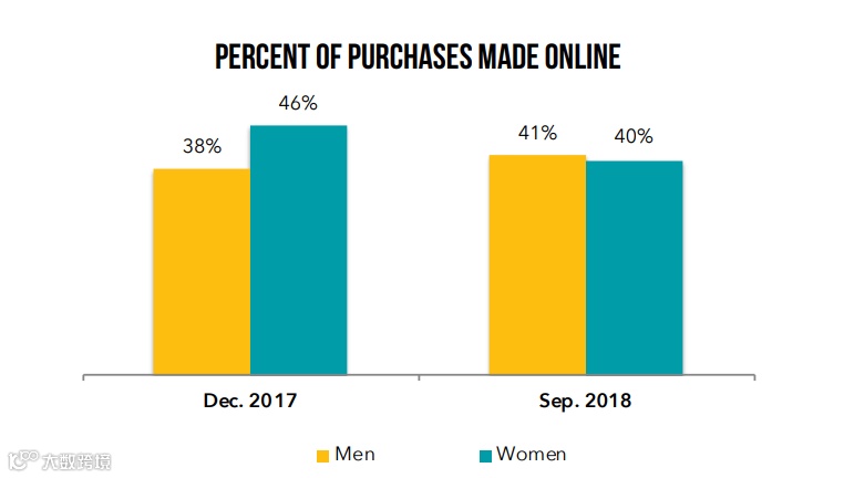 数据显示,近年来男性网购的比率逐年攀升。2018年,男性网购占比达到 41%,相较去年上升了 3%,首次超过了女性。而2018年女性的网购占比相较2017,下降了 6%。此外,有 53%的男性表示一个月内要在亚马逊上网购至少 6 次,而达到这一频次的女性仅占比 45%。