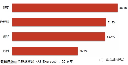 俄罗斯跨境电商发展突飞猛进。2016年俄罗斯跨境商务规模高达30亿美元,其中60%来自中国,俄罗斯网购人数超过 4000 万,而且每一年跨境商务增长都达到了30%,有2500万俄罗斯人有从跨境电商网购的经历,大部分从中国定购商品。网购使用率达到41.2%。跨境电商进口实物销售额为 43 亿美元,比 2015 年增长了 26.5%。在金砖五国中,俄罗斯网购消费者的跨境电商使用率要明显高于其他四个国家。