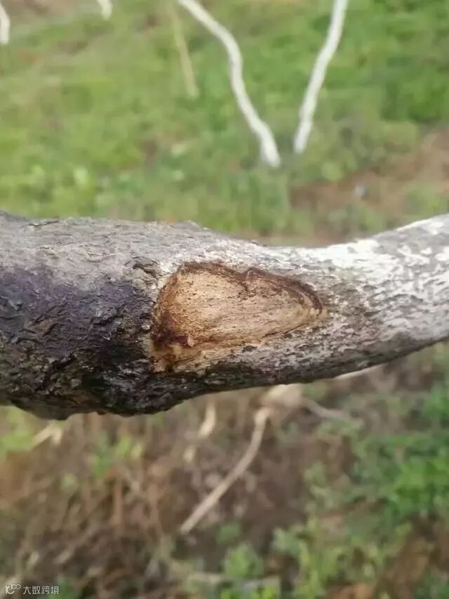 3:症状表现有差异。伤流在剪锯口处多为清水状,偶尔出现白色泡沫状(有机物),但和伤流液有离层。总而言之,伤流是没有浓度的清水状汁液(南方地区树体伤流前会从髓层流出白色黏稠物,但没有水渍,也是伤流的前期表现)。溃疡病发生后,感病处的汁液是有浓度的,初期流出的是乳白色黏液,随时间推移,逐渐氧化,变为黄红色黏液,最后变成锈红色黏液。溃疡病感染的枝条或部位,用手抠开皮层,韧皮部是青褐色、褐色、红褐色等发生病变的色泽,但伤流的枝干抠开皮层后韧皮呈正常的绿白色。