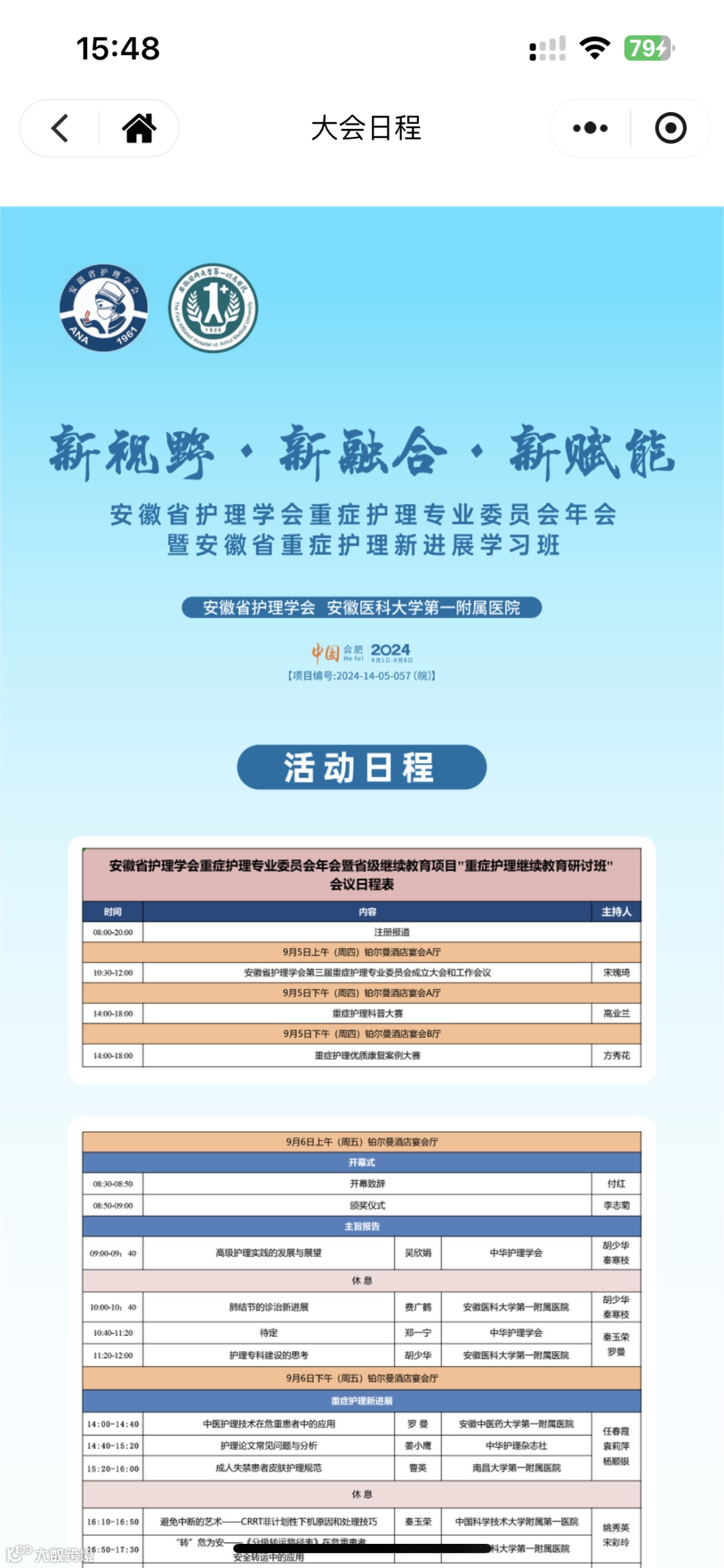 由安徽省护理学会、安徽医科大学第一附属医院主办的安徽省护理学会重症护理专业委员会年会暨安徽省重症护理新进展学习班于今年9月在合肥举办。为了进一步传递重症专科护理的学术新动态、加强重症专科护理的学术交流,此次年会使用了智慧会务小程序。