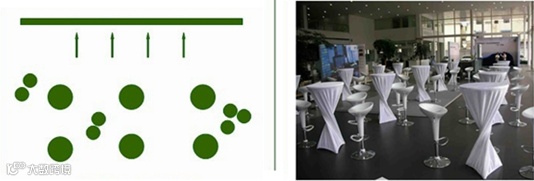 特点:自由的活动空间可以让参会者自由交流,构筑轻松自由的氛围。经常与其它摆台形式结合使用;配少量的高圆桌(直径380~760 MM)、沙发椅等,客人主要站立交谈,有侍者穿梭递送酒水和小食品,或放于小的布菲台上,可能设现场的服务吧台。