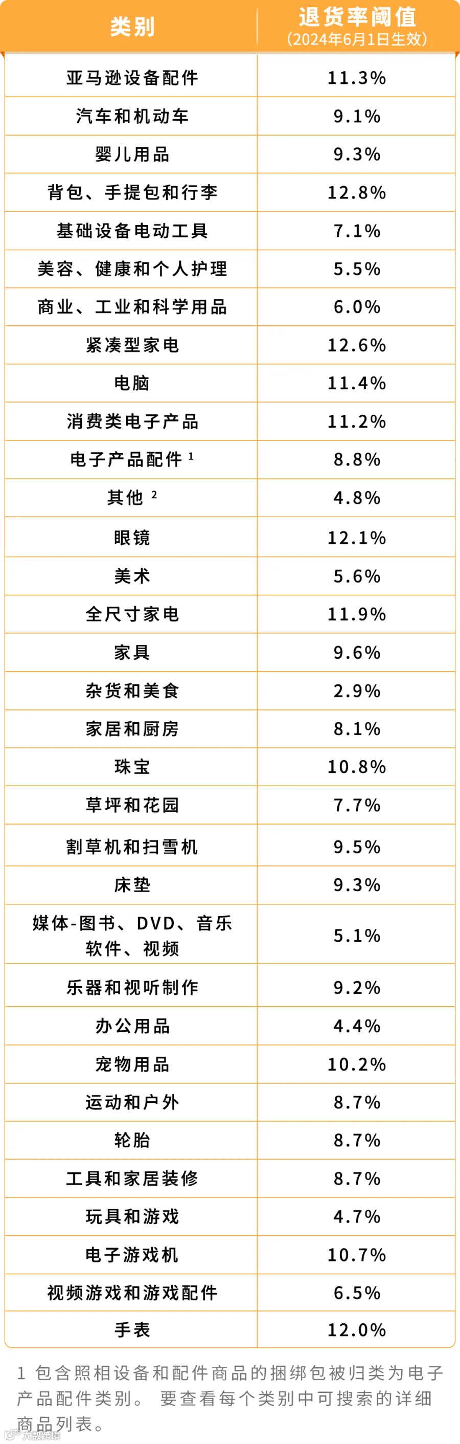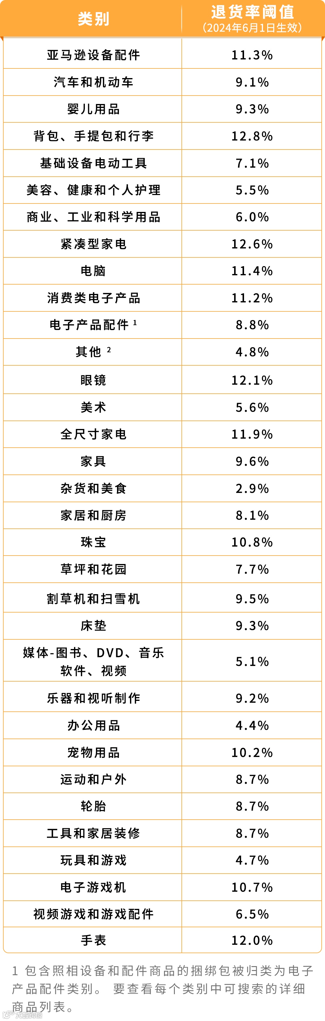 据悉,自2024年6月1日起,亚马逊将对所有分类(除服装和鞋靴外)中退货率超出特定阈值的商品实施退货处理费的收取政策。此项费用仅针对那些退货率超过每个分类所设定标准的商品。