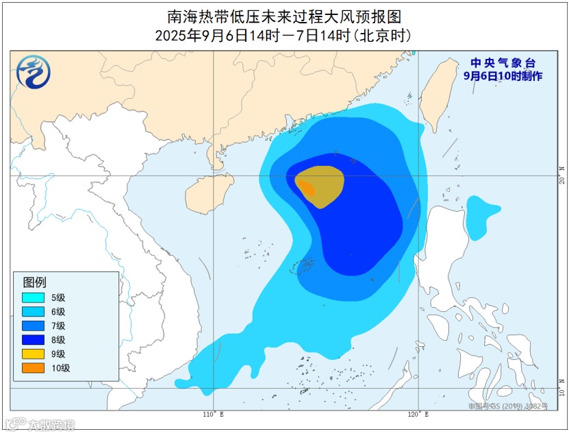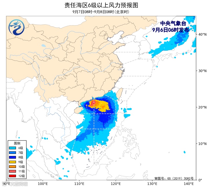 大风预报:9月6日14时至7日14时,南海大部、巴士海峡、台湾海峡南部、珠江口区、广东中东部沿海将有6-8级大风,其中南海北部部分海域风力可达9-10级,阵风11-12级。