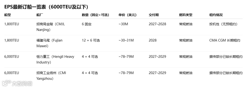 具体而言,EPS还在8月上旬刚刚与福建马尾造船签订了最多18艘1,800TEU支线箱船的合同,包括12艘确报及6艘选择权,单价在3,000多万美元。