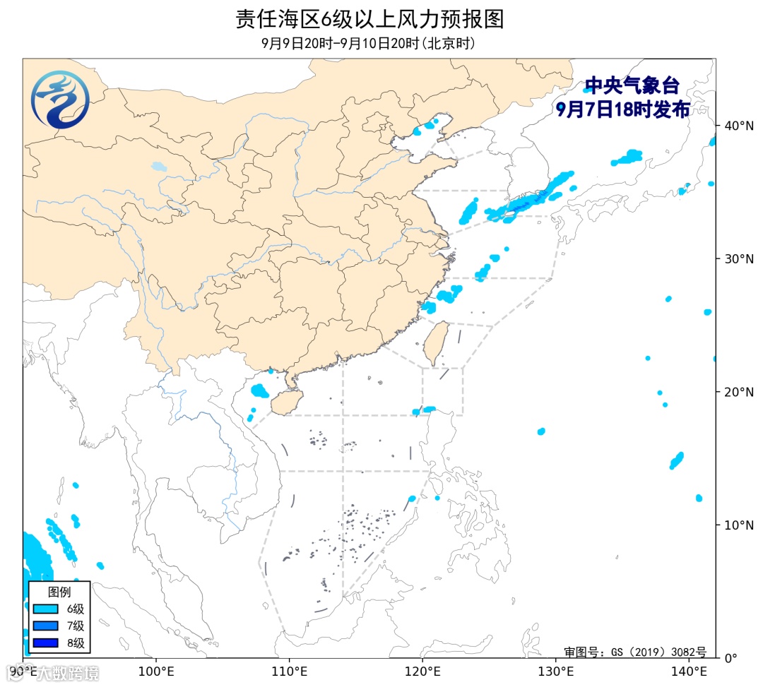 8日20时至9日20时,黄海南部海域将有5~6级、阵风7级的东北风。
