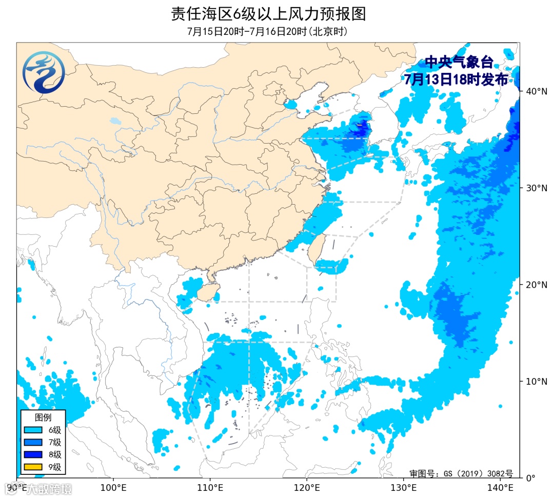 大风预报:7月13日20时至14日20时,东海东部和西南部海域将有6-7级、阵风8-9级的大风。