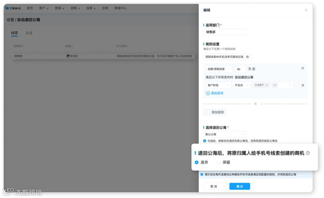 对于自动退回公海的企业和手机号线索,支持废除所关联的原归属人商机,无需管理员再手动转移商机,降低人工成本 。通过自动化流程,线索的重新分配变得更加方便,提高管理效率和灵活性。