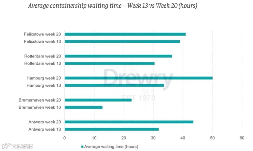 与此同时,全球港口也正陷入新一轮紧张状态,尤以北欧枢纽港最为严重。据Drewry发布的最新数据显示,2025年第20周欧洲五大港口的平均集装箱船等待时间相比第13周普遍上升。其中,汉堡港的靠泊等待时间已逼近50小时,成为欧洲最拥堵的港口。安特卫普、鹿特丹、费利克斯托和布雷梅港也均出现不同程度的排船积压。莱茵河水位持续走低进一步限制了内陆驳船运力,特别是对安特卫普和鹿特丹的陆侧转运构成额外压力。更雪上加霜的是,5月20日比利时全国大罢工使安特卫普-布鲁日港作业短时间内陷入瘫痪,拥堵问题持续恶化。