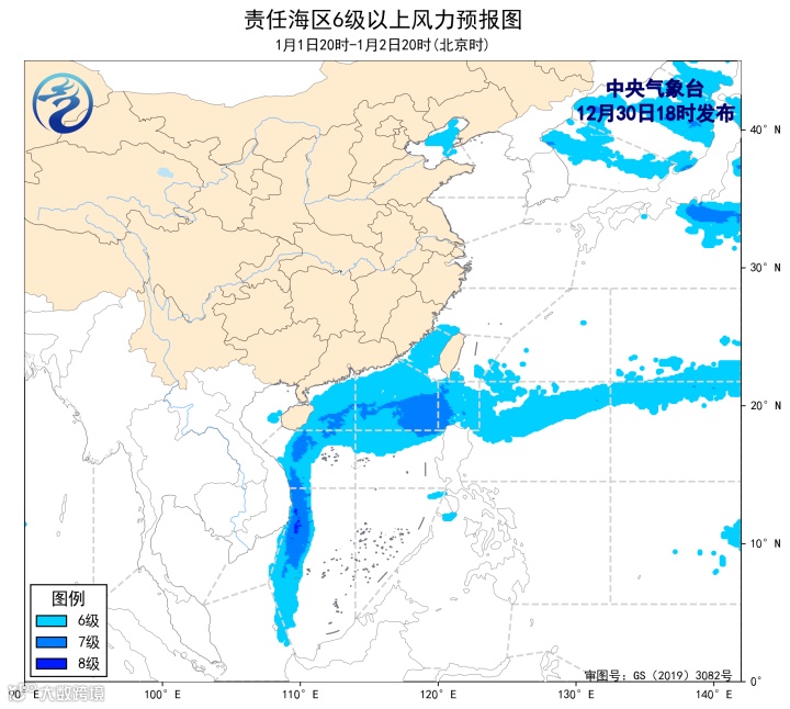 12月31日20时至1月1日20时,台湾海峡、台湾以东洋面、巴士海峡、南海中部、东北部和南海西南部海域将有5~7级、阵风8级的偏北到东北风,渤海将有5~6级、阵风7级减弱到4级以下的偏西转偏东风,东海北部海域将有5~6级、阵风7级减弱到4级以下的偏北风,东海南部海域、南海西北部海域将有4~6级、阵风7级的东北风。