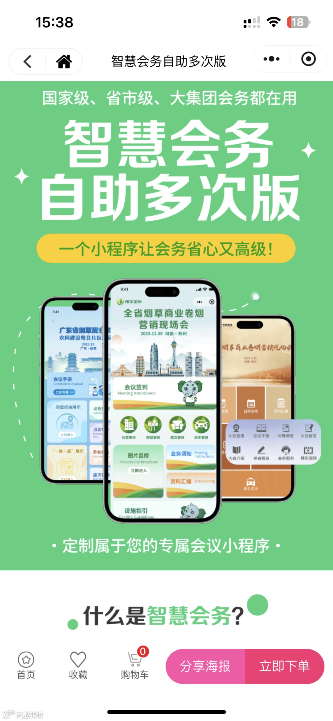 点击“商城”可跳转至“智慧会务商城”小程序,您可以在小程序内查看各个版本的介绍详情和价格,可以根据您的需求选择合适的版本下单。