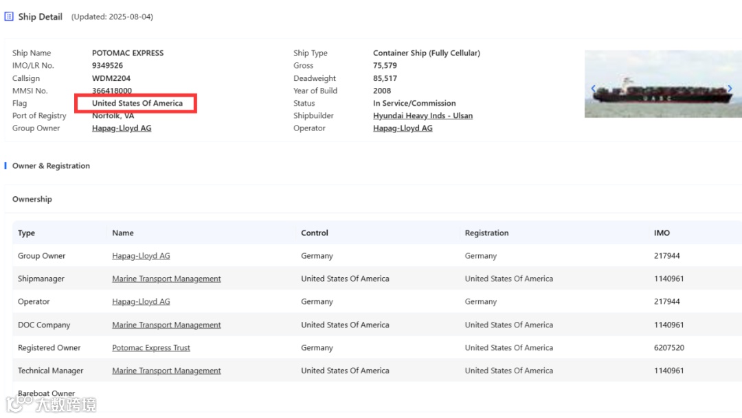 资料显示,Potomac Express轮为赫伯罗特旗下一艘悬挂美国旗的船舶 截图来源:船视宝