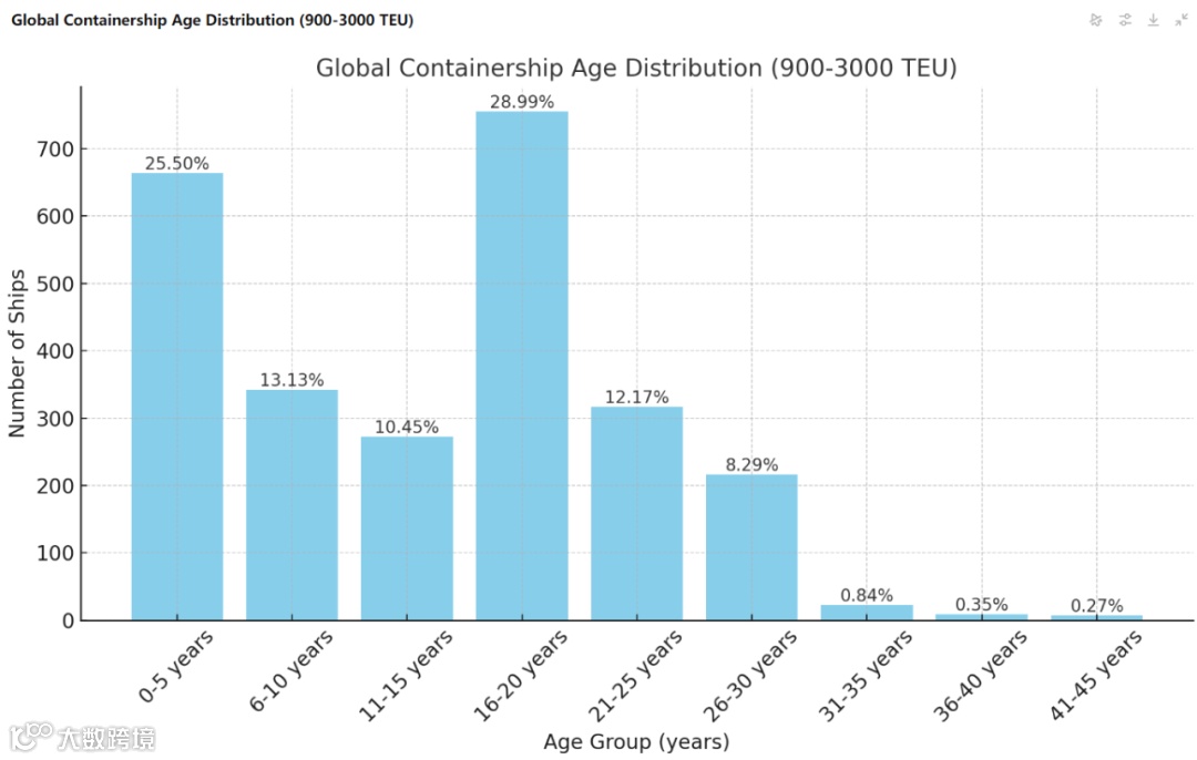根据克拉克森研究的数据,截至今年9月26日的数据,全球集装箱船队中900TEU-3000TEU类型的集装箱船舶数量总船数为2604艘,平均船龄为 12.88年,最老的船的船龄达到了44岁。