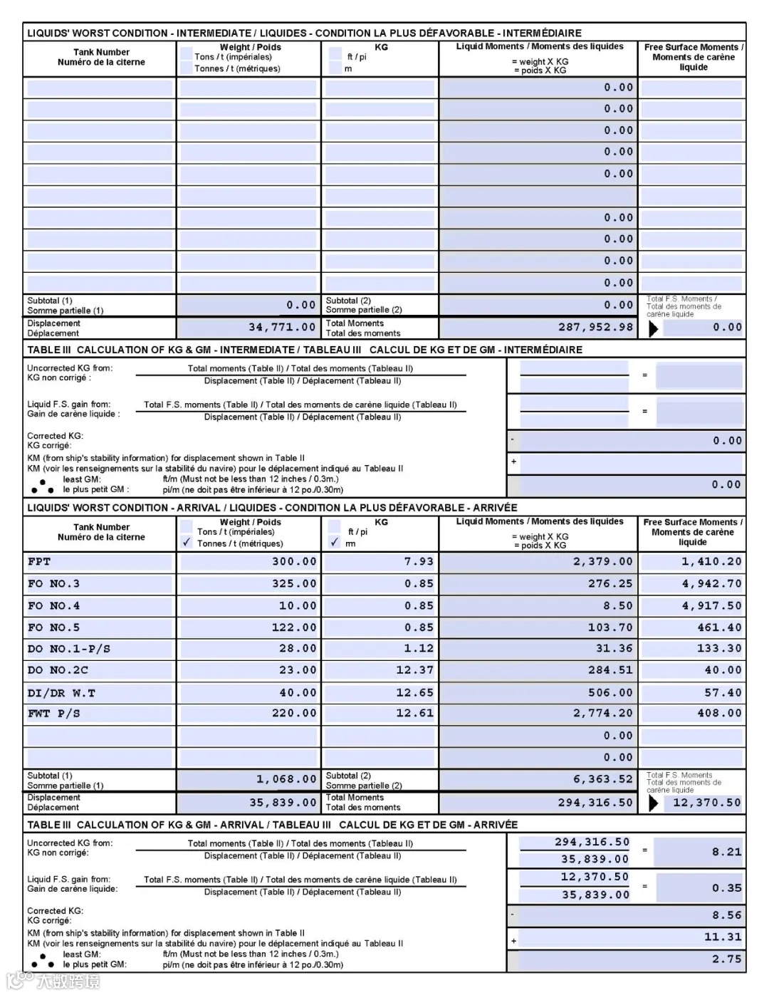 三、Table Ⅲ:此表为重心高度和初稳性高度的计算(Calculation of KG & GM),加拿大散粮计算表格中,此处的计算较为简单,表格中对每一步骤的计算都给出了具体的说明;