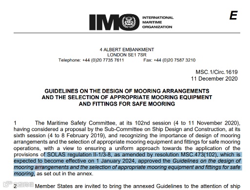 先是找到了SOLAS公约的II-1/3-8和提到的MSC.1/Circ.1175。而后找到MSC.1/Circ.1619 - Guidelines on the Design of Mooring Arrangements and the Selection of Appropriate Mooring Equipment and Fittings for Safe Mooring 。