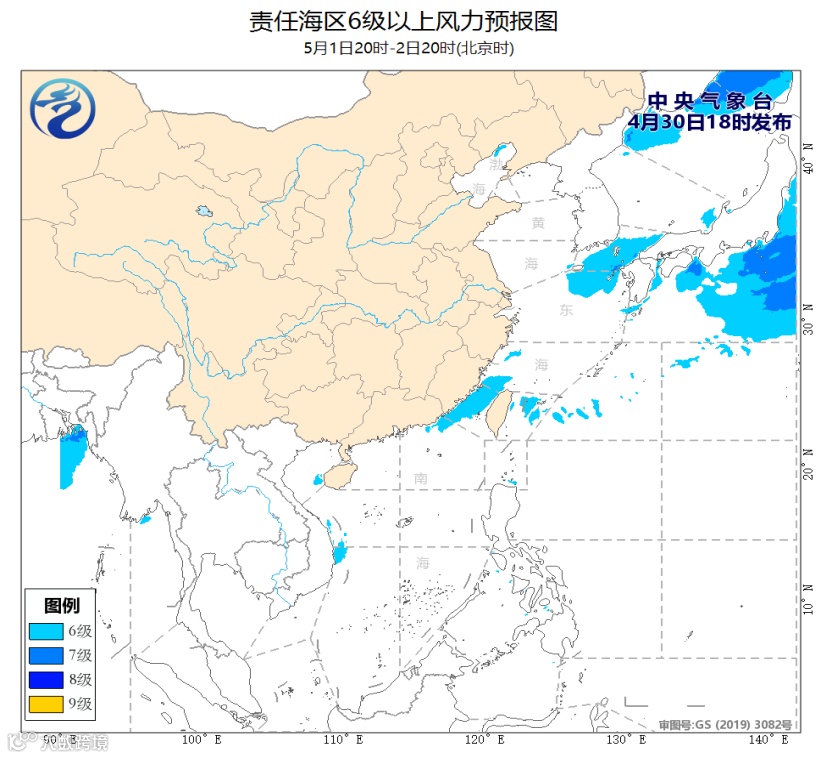 预计,4月30日夜间至5月1日白天,东海大部海域、台湾海峡、台湾以东洋面、南海北部和中西部海域、北部湾将有6~7级、阵风8级的风,其中30日夜间东海东部的部分海域的风力可达8~9级、阵风10级。5月1日夜间至3日白天,东海东北部海域、台湾海峡、北部湾将有5~7级的风。