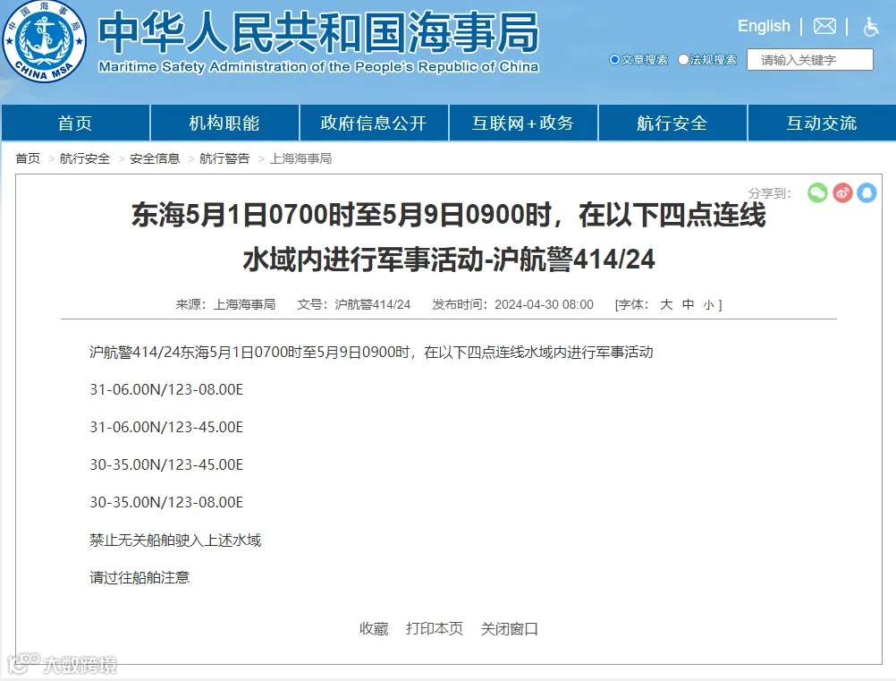 据中国海事局网站消息,上海海事局4月30日发布两条航行警告。