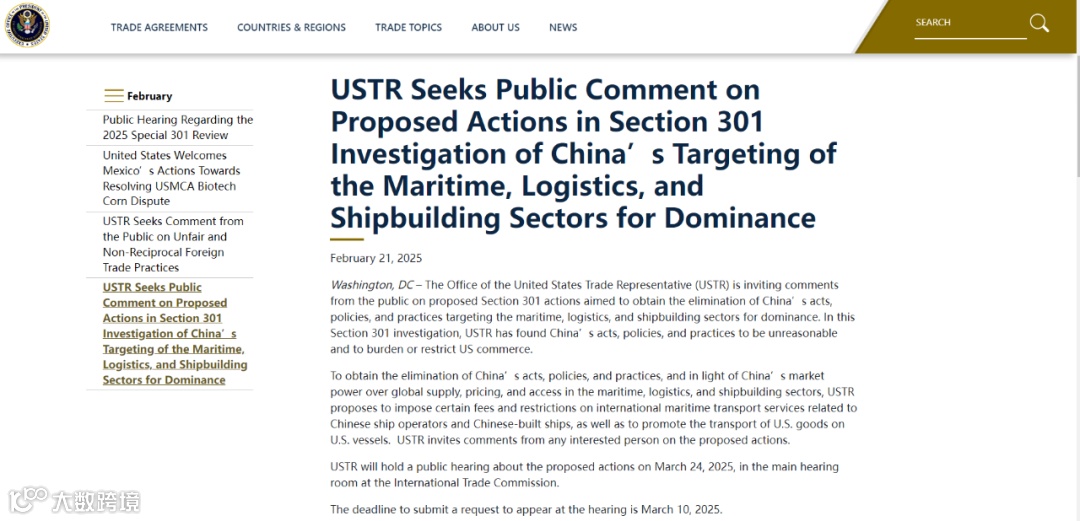 line-height: var(--ds-md-line-height);color: rgb(64, 64, 64);font-family: Inter, system-ui, -apple-system, BlinkMacSystemFont, "Segoe UI", Roboto, "Noto Sans", Ubuntu, Cantarell, "Helvetica Neue", Oxygen, "Open Sans", sans-serif;letter-spacing: normal;text-align: start;">2025年2月21日,美国贸易代表办公室(USTR)发布通知,宣布就针对中国海事、物流和造船业的301调查拟议行动举行公开听证。此次调查基于2024年4月启动的301条款程序,声称旨在应对中国在上述领域“占据主导地位”的行为、政策和做法对“美国商业造成的负担或限制”。