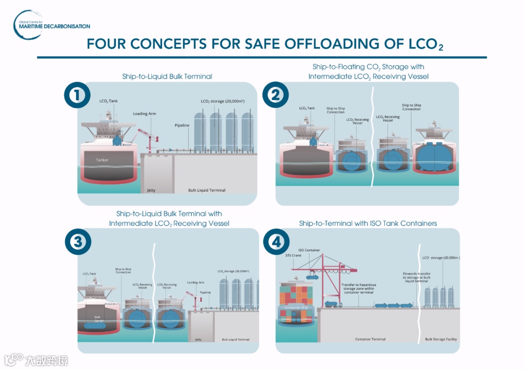 我们首先要考虑的一个问题是如何将 LCO2安全地卸载至合适的基础设施。研究认为,将捕集的二氧化碳转为液化形式可能是船上储存和运输最有效且最具成本效益的选择。在此基础上,该研究筛选出四个概念,涵盖船到船和船到岸等主要卸载模式,其可作为可组合的构件,以覆盖更广泛的卸载概念。