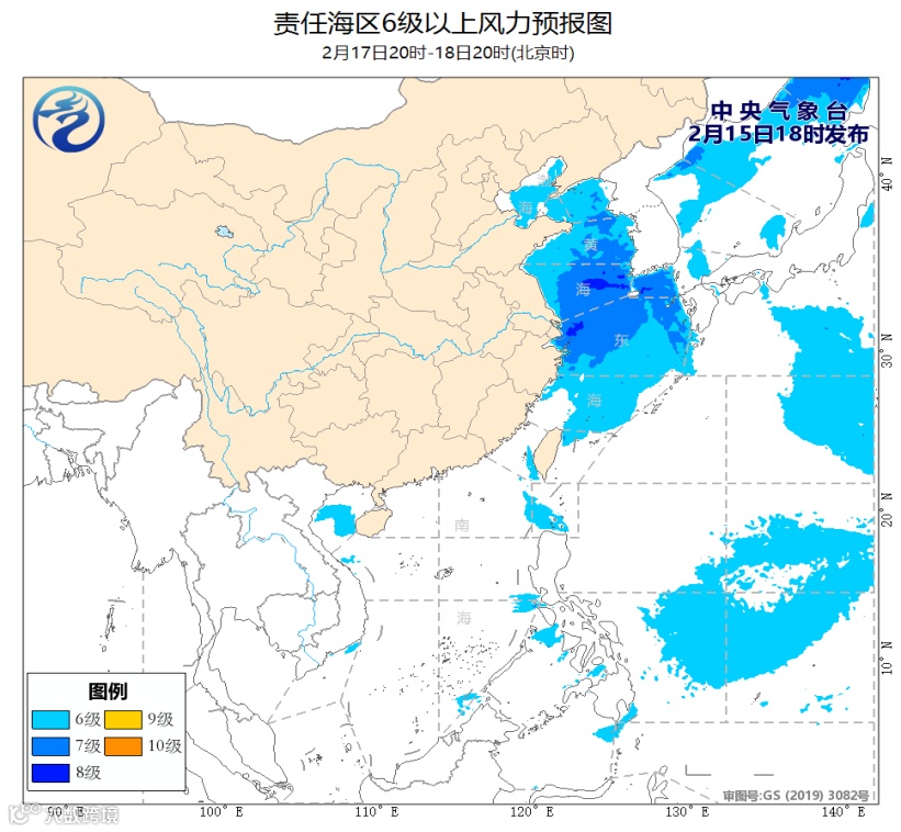 15日夜间至18日白天,渤海、渤海海峡、黄海大部海域、东海大部海域、台湾海峡、南海大部海域将有6~7级、阵风8级的大风,其中黄海南部海域、东海西北部海域、台湾海峡、南海西南部海域将有8级、阵风9级的大风。