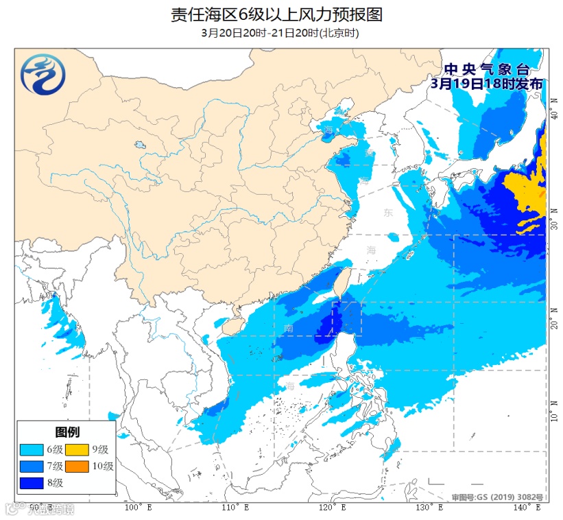 预计,19日夜间至22日白天,渤海、渤海海峡、黄海大部海域、东海大部海域、台湾海峡、台湾以东洋面、巴士海峡、南海大部海域、北部湾将有6~7级,阵风8级风,其中台湾海峡、巴士海峡、南海东北部部分海域风力可达8级,阵风9-10级。