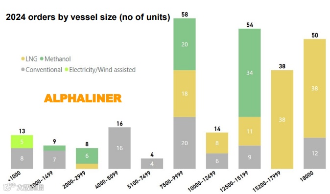 值得一提的是,尤其是大型船舶几乎全部选择了液化天然气(LNG)推进系统。今年,14,000标准箱(TEU)以上的船舶尚未有任何甲醇推进系统的订单——详见下图。