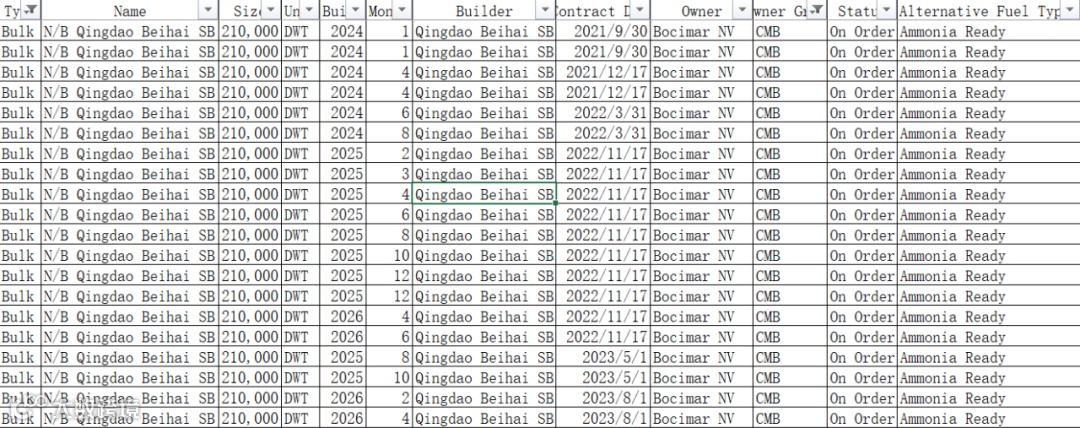 根据克拉克森最新数据显示,目前CMB(通过Bocimar持有)已经在北海造船订造了多达20艘的氨预留的21万吨级的干散货船舶。