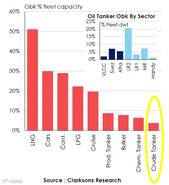 这其中,原油油轮的订单更少,占现有船队比例的4%,而VLCC占现有船队的比例则是更少的2%。