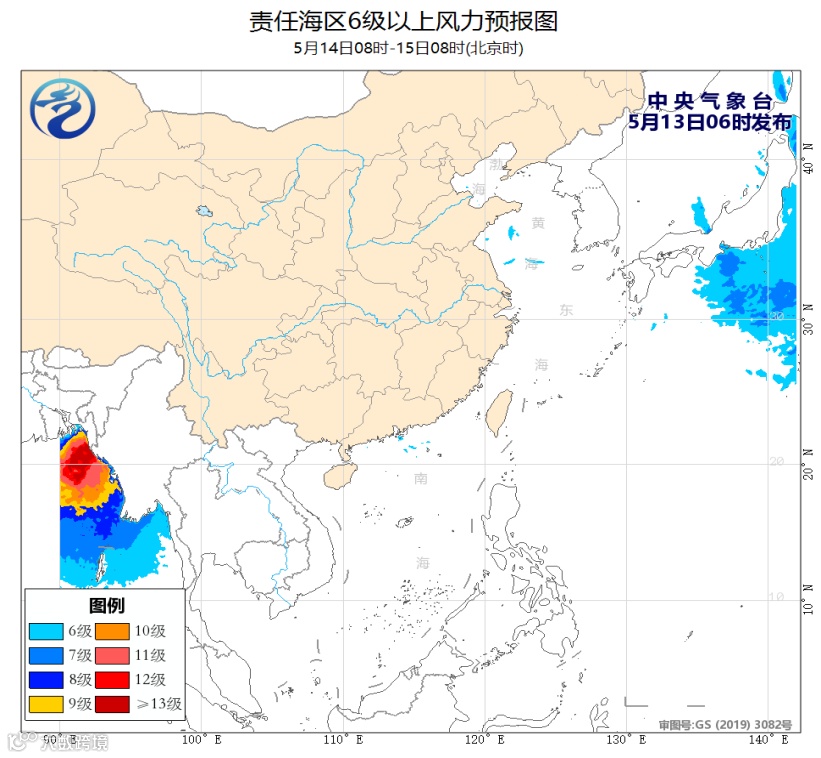 13日白天至夜间,北部湾将有5~6级、阵风7级的偏北风。