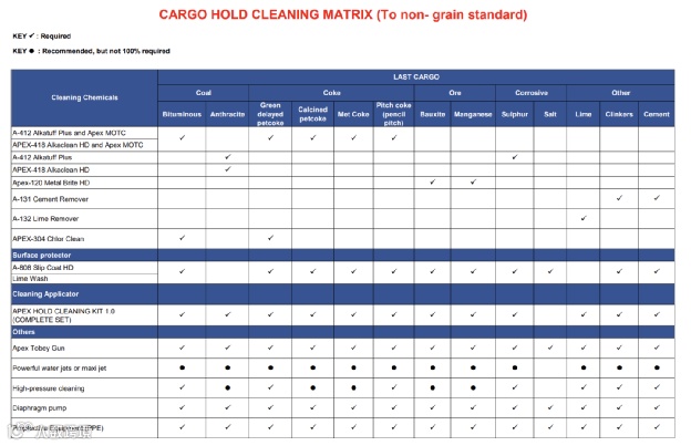 散装货物包括非常广泛的商品。装载前所需达到的清洁标准和额外准备将取决于要装载的货物类型。管理公司应提供全面的货舱清洁指南、程序、货物变更的Hold cleaning Matrix和货舱清洁检查清单。清洁矩阵(cleaning matrix)是船舶营运管理中关于船舶清洁度检查与控制的一项重要工具。它列出了各舱室与区域的清洁标准,确保船舶达到公司与客户所要求的清洁水平。