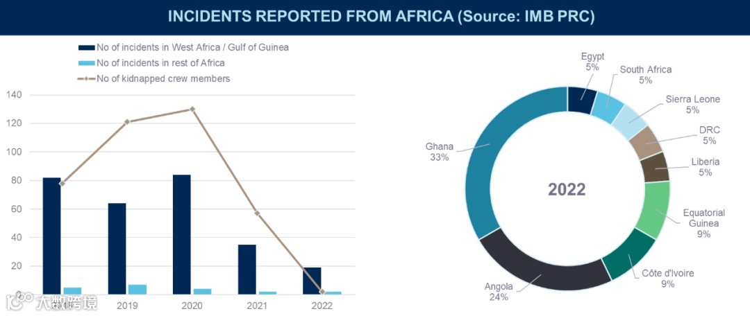 由于尼日利亚2022年没有事故记录,加纳和安哥拉已经上升到西非国家报告海盗事件数量的首位。在2022年的几内亚湾,超过三分之二的事故发生在船舶抛锚或停泊时,加纳的塔科拉迪锚地和安哥拉的罗安达锚地都被IMB PRC列入了“2022年有三起或三起以上事件报告的全球港口和锚地”名单。同样值得注意的是南非和埃及六年多来首次出现在IMB PRC的年度报告中。