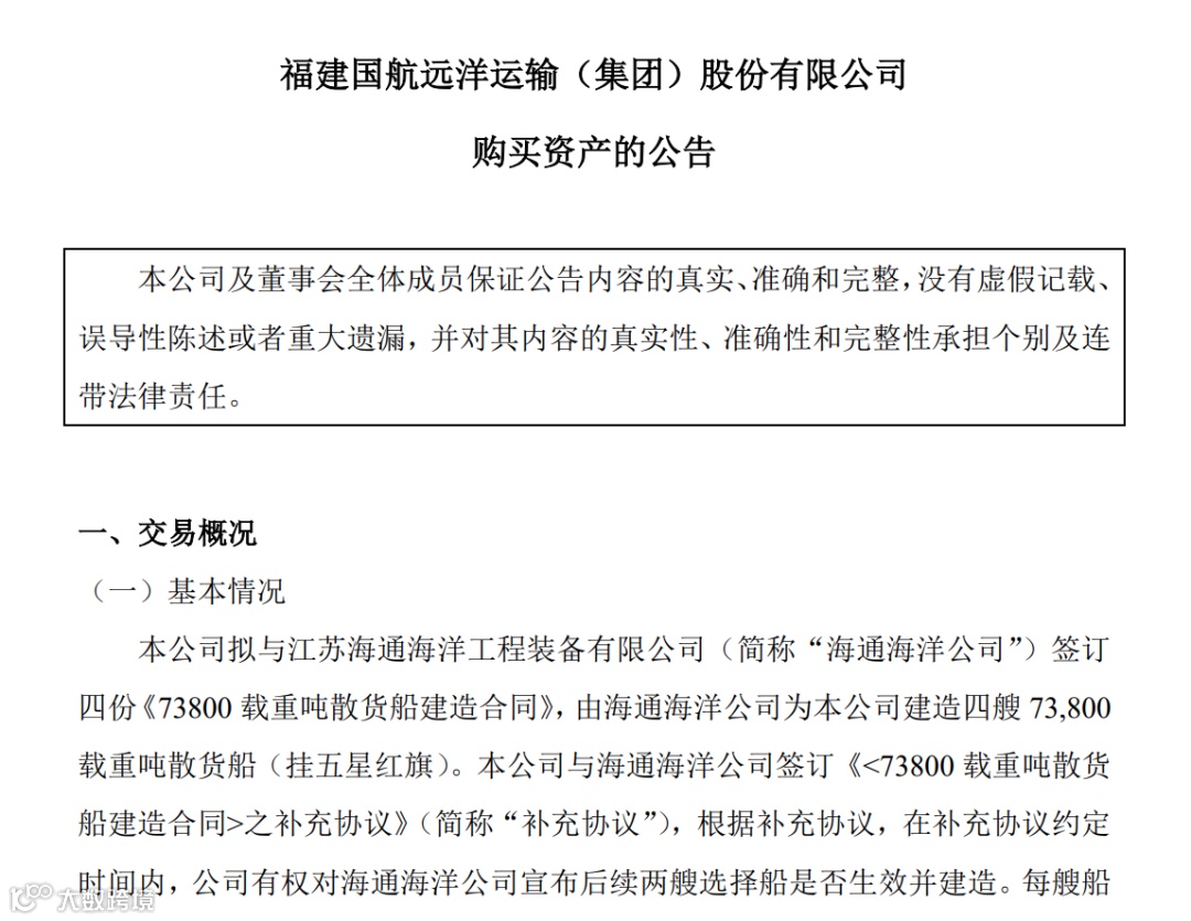 导读:1月16日,福建国航远洋运输(集团)股份有限公司相继发布公告称,该公司拟订造4艘总价值8.64亿元的7380