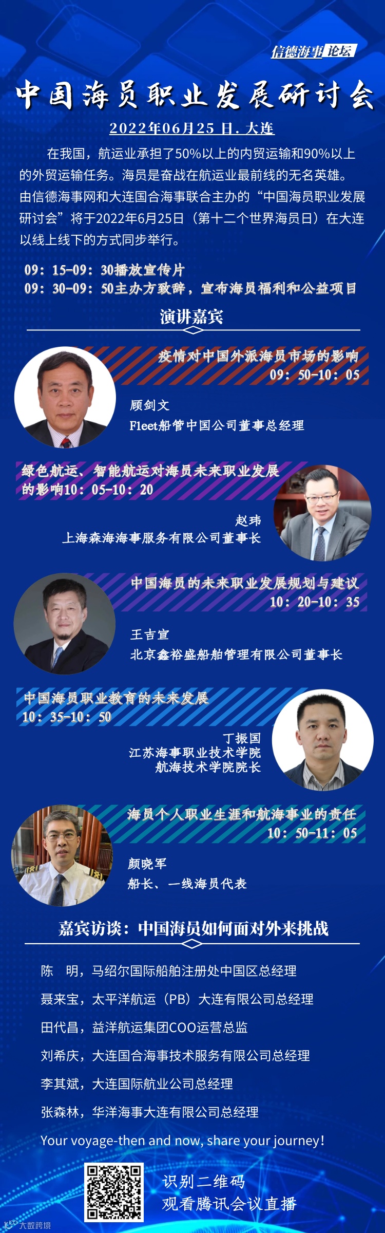 在此背景下,由信德海事网和大连国合海事技术服务有限公司联合主办的“中国海员职业发展研讨会”将于2022年6月25日(第十二个世界海员日)在大连以线上线下的方式同步举行。