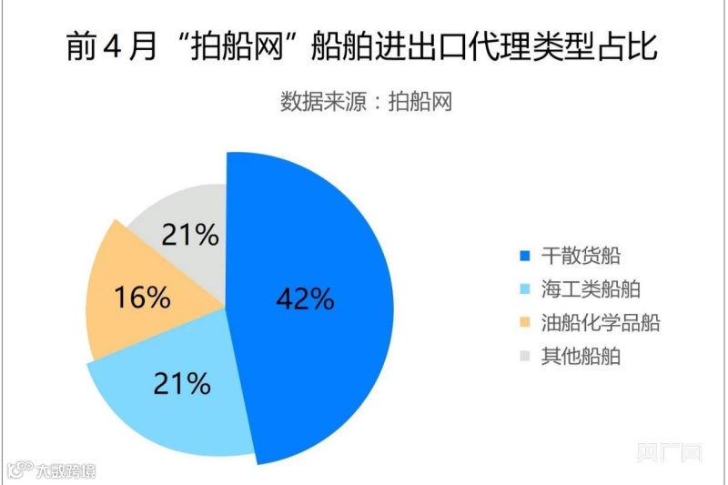 从全国二手船舶进出口艘数看,通过“拍船网”交易的干散货类船舶、油船化学品船和海工类船舶的占比分别达到63%、50%和50%。