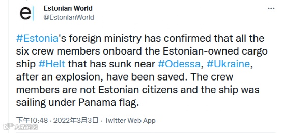 3.3日晚上,总部位于爱沙尼亚的管理公司Igor Ilves发文表示:“Helt”号在敖德萨约20海里处触到一枚水雷,这艘船在吃水线以下出现了一个洞,最终沉没。救生筏上有两名船员,另有四人下落不明。”