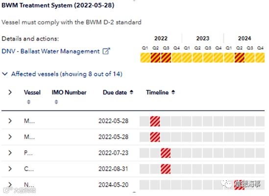 为支持上述条款和其他监管法规,DNV 推出了一款称为“Compliance Planner”的工具,仅在 My Services on Veracity 状态下可供 DNV 客户使用。该工具使客户能够轻松地跟踪即将出台的法律法规和船舶、船队遵守法规的截止日期。在Compliance Planner上,客户还将看到 BWM 公约的截止日期。下图是该功能在Compliance Planner 上的界面: