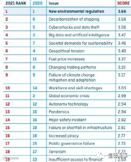 环境问题是2021年航运业最关心的问题。航运脱碳、新的环境法规以及未能减轻或适应气候变化(减缓和适应气候变化是应对气候变化挑战的两个有机组成部分),在问题影响和可能性方面得分很高,但在准备情况方面得分低得令人担忧。