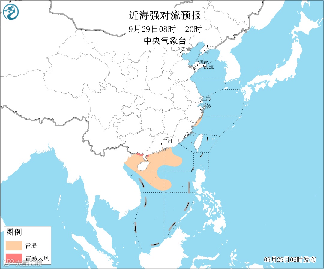 29日白天至夜间,广东西部沿岸和广西沿岸海域海域将有8~10级的雷暴大风。